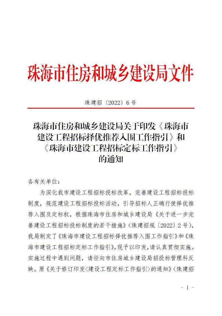 • 珠海市住房和城鄉建設局關于印發《珠海市建設工程招標擇優推薦入圍工作指引》和《珠海市建設工程招標定標工作指引》的通知